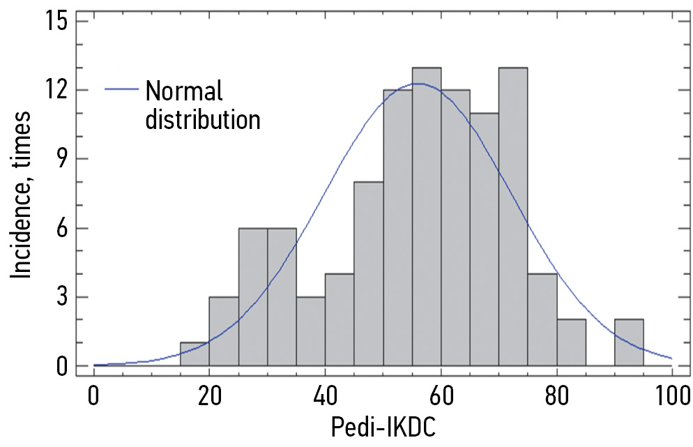 Fig. 1. Histogram of the distribution of patient survey results according to the Pedi-IKDC questionnaire with normal distribution density curve