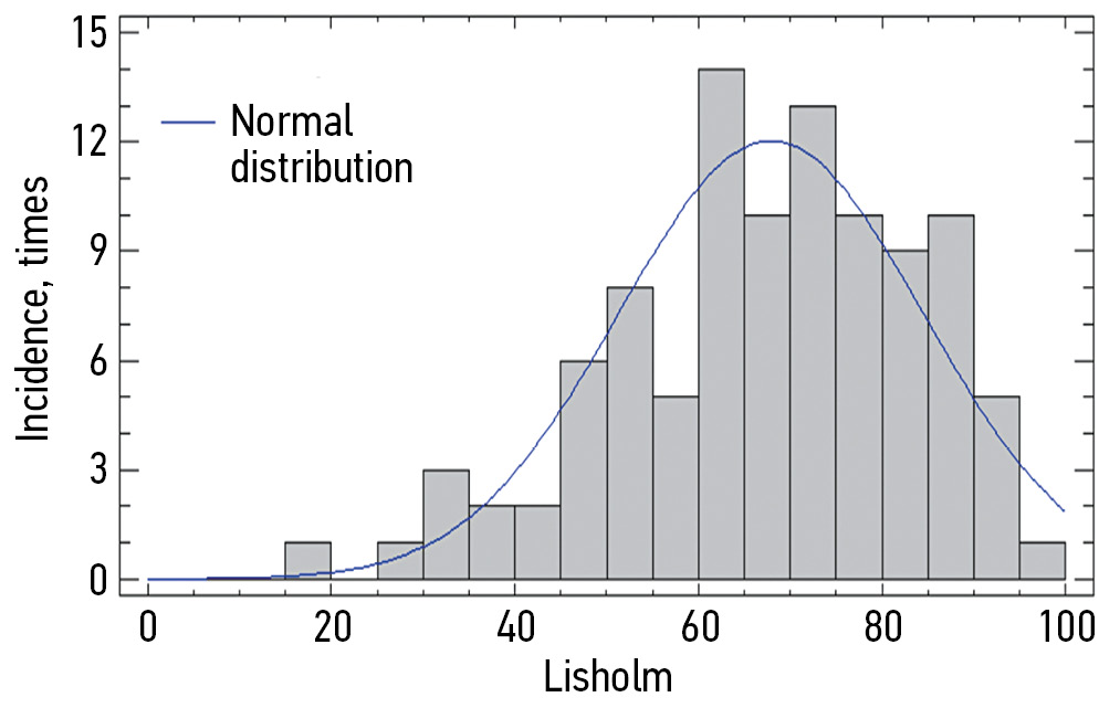 Fig. 2. Histogram of the distribution of patient survey results according to the Lysholm questionnaire with normal distribution density curve