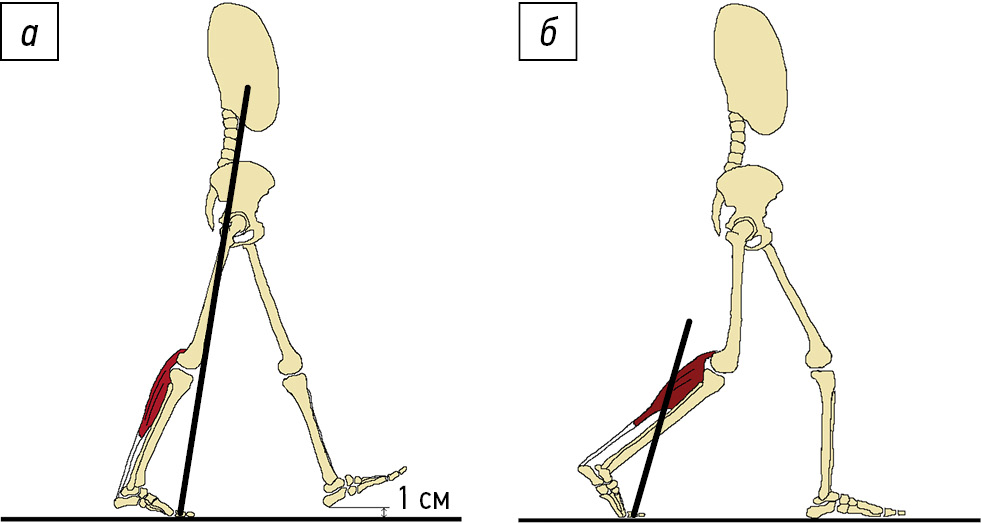 Фаза терминальной опоры одноопорная. Она начинается с подъема пятки опорной стопы и продолжается до контакта контралатеральной конечности с поверхностью. В фазе терминальной опоры проекция вектора сил реакции опоры находится в области переднего отдела опорной стопы, что создает значительный сгибательный крутящий момент в голеностопном суставе. Однако эксцентрическое сокращение всех мышц сгибателей стопы — икроножной, камбаловидной, длинного сгибателя I пальца, длинного сгибателя пальцев, задней большеберцовой, длинной и короткой малоберцовых мышц — оказывает блокирующий эффект на дорсофлексию голеностопного сустава в пределах 10°, для того чтобы облегчить подъем пятки вместе с движением голени вперед. При этом головки плюсневых костей и пальцы стопы становятся опорой для всего тела, а разгибание в плюснефаланговых суставах создает условие для продвижения проекции вектора тела вперед. Другое название данного процесса — «скатывание» или roll-off. Дальнейшее смещение проекции центра тяжести тела за площадь опоры, представленной пальцами стопы, приводит к свободному падению 60 % массы тела вперед с высоты около 1 см за 0,02 с (рис. 1, а) [4]. Однако контакт с поверхностью контралатеральной конечности, заканчивающей период переноса, предотвращает падение тела и обеспечивает стабилизацию положения центра тяжести над вновь сформированной площадью опоры [16–19].