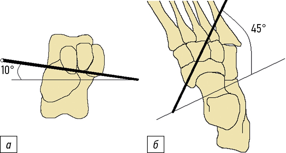 Рис. 2. Ось движения первого луча: а — горизонтальная плоскость; б — фронтальная плоскость (Michaud T. Foot orthosis. Baltimore, 1993; [55], с модификациями)