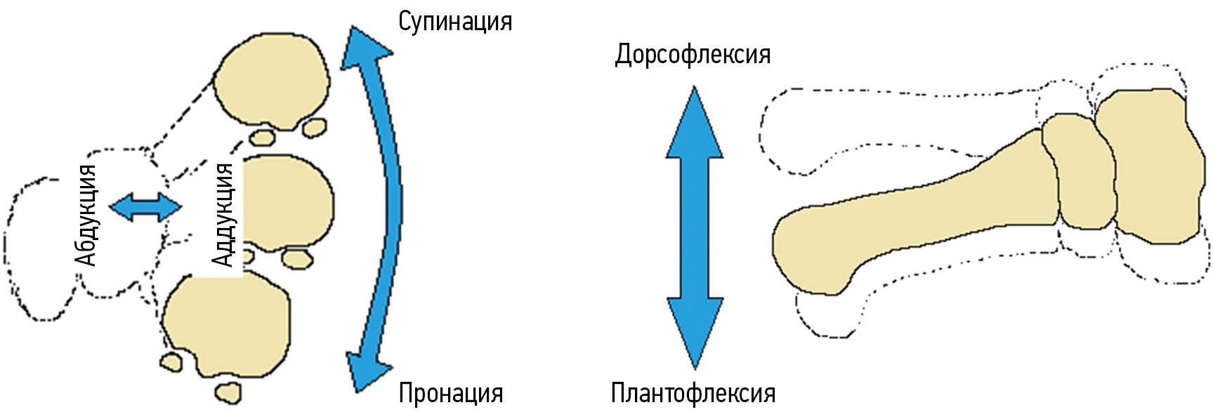 Движение первого луча стопы — одноосное и трехплоскостное. В сагиттальной плоскости данное движение осуществляется в направлении плантофлексии и дорсофлексии, в горизонтальной плоскости — отведения и приведения, во фронтальной плоскости — супинации и пронации. По данным множества авторов, плантофлексия первого луча сочетается с его пронацией и отведением, то есть эверзией, а дорсофлексия — с супинацией и приведением, то есть с инверзией (рис. 3) [24–31].