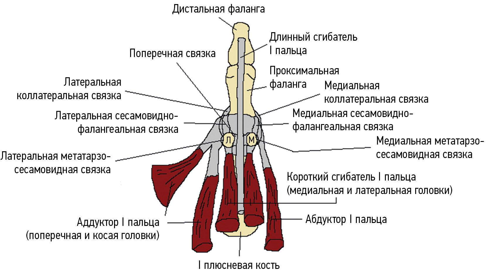 Медиальные и латеральные коллатеральные связки, сесамовидно-фалангеальные связки, метатарзо-сесамовидные связки, а также поперечная межсесамовидная связка формируют треугольник с тремя связками с каждой стороны сустава, плотно вплетаясь в капсулу сустава (рис. 4) [38]. Большей стабилизации способствует поперечная межсесамовидная связка, располагающаяся поперек между сесамовидными костями, формирующая лямку или ремень и тем самым ограничивая расхождение сесамовидных костей при нагрузке.