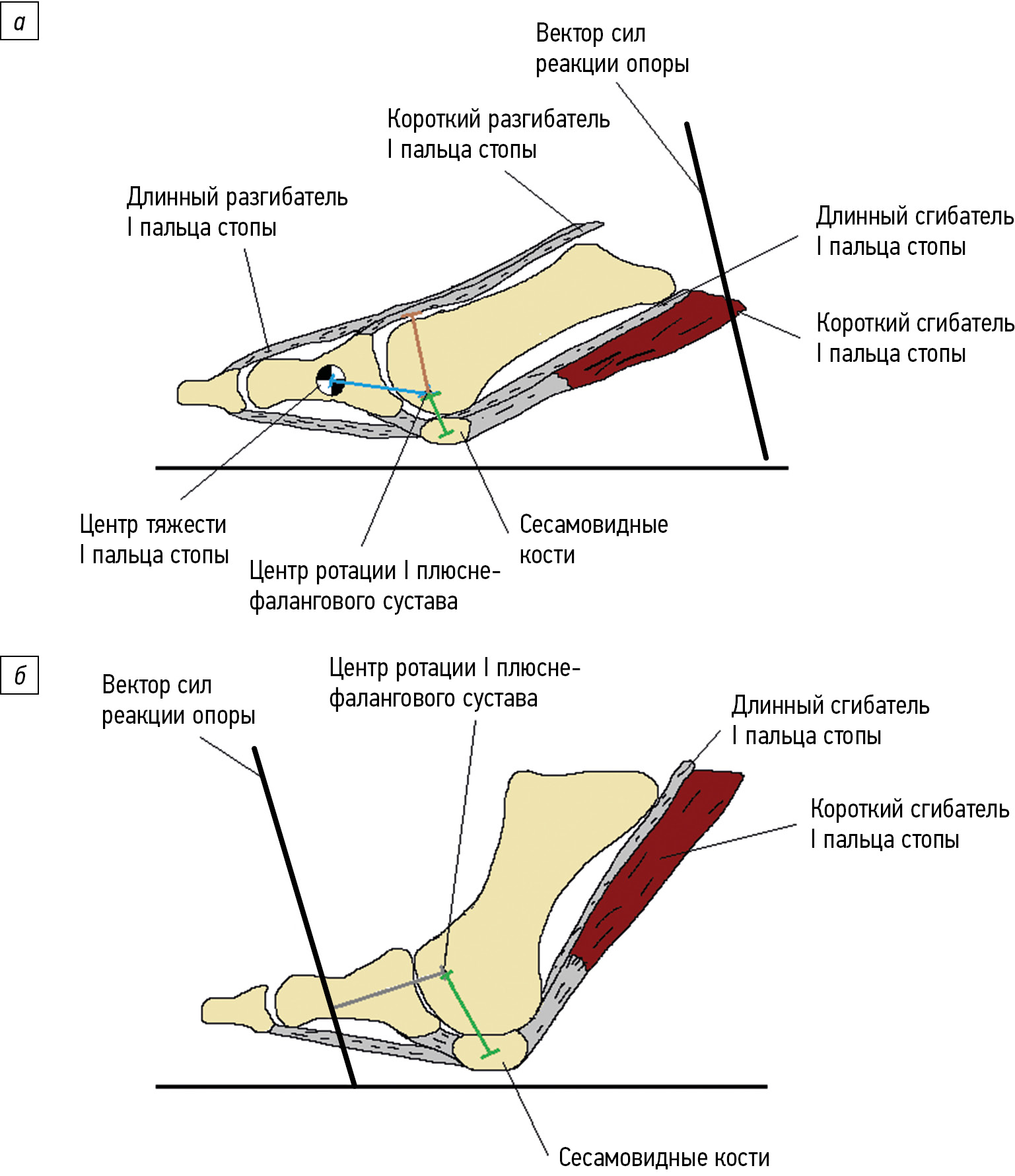 При подъеме пятки и движении тела вперед в фазе терминальной опоры и предпереноса проекция сил реакции опоры смещается кпереди от оси вращения первого плюснефалангового сустава. Это увеличивает плечо рычага разгибательного крутящего момента и вызывает пассивное разгибание I пальца. Пассивное разгибание в первом плюснефаланговом суставе приводит к тому, что ось мышечного брюшка короткого и длинного сгибателей I пальца будет располагаться под углом по отношению к месту прикрепления их сухожилий к проксимальной и дистальной фалангам I пальца соответственно. Кроме того, в этом положении обе мышцы имеют эффективное плечо рычага для сгибания I пальца или, другими словами, ограничивают разгибание I пальца в плюснефаланговом суставе (рис. 7, б). При положении пятки на поверхности и по причине отсутствия разгибания I пальца активации мышц сгибателей пальцев не происходит. При этом тяга длинного сгибателя I пальца, а также короткого сгибателя I пальца стопы без эффекта блока при нахождении сесамовидных костей под головкой плюсневой кости будет стабилизировать I палец стопы против головки плюсневой кости, но не против поверхности (рис. 7, а) [22].