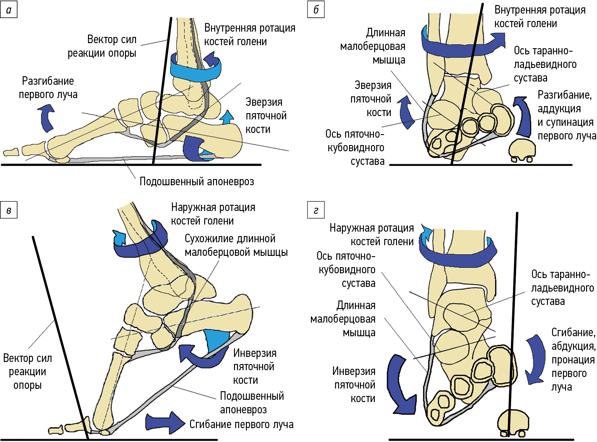 В фазе принятия нагрузки (loading response) амортизирующая функция стопы осуществляется за счет вальгуса заднего отдела, пронации и разгибания среднего отдела и супинации переднего отдела стопы. Вальгус заднего отдела стопы в данную фазу периода опоры обусловлен эверзией пяточной кости, внутренней ротацией костей голени с фиксированной в «вилке» голеностопного сустава таранной костью, которая находится в положении приведения, сгибания и супинации. Подобное соотношение в подтаранном суставе определяет паралелльное расположение осей таранно-ладьевидного и пяточно-кубовидного суставов, что увеличивает мобильность шопарова сустава, приводя к пронации и разгибанию среднего отдела стопы. Передний отдел стопы в данной фазе супинирован относительно пяточной кости преимущественно за счет разгибания, аддукции и инверзии первого луча (см. рис. 8, а, б).
