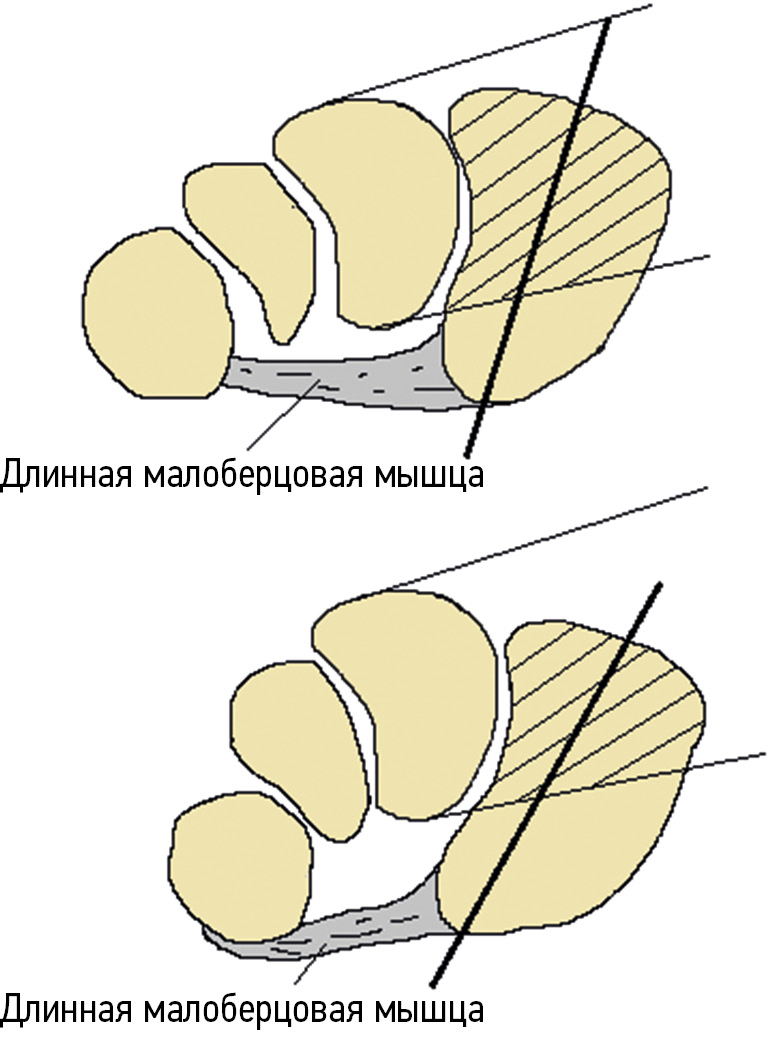 Рис. 10. Расположение осей абдуктора I пальца и длинной малоберцовой мышцы относительно результирующей оси движения первого луча стопы. Объяснения см. в тексте