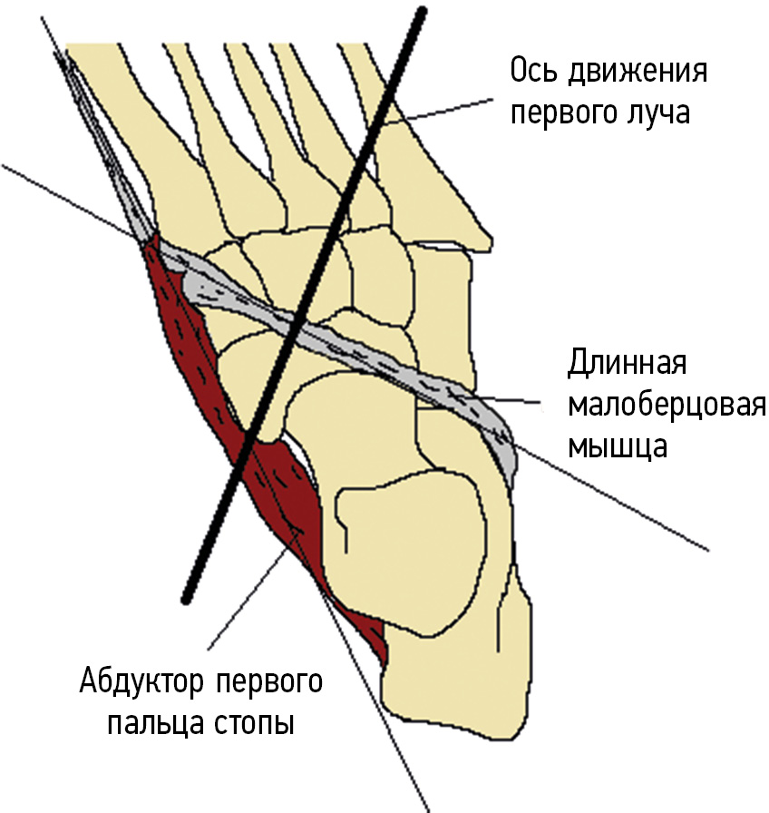 Функция абдуктора I пальца стопы как активного сгибателя первого луча достаточно дискутабельна. Данная мышца располагается под углом 45° к оси первого луча, создавая эффективный рычаг для его сгибания. Однако ось сухожилия длинной малоберцовой мышцы находится под углом 90° к оси движения первого луча, что делает ее сгибательный крутящий момент более эффективным (рис. 10). В то же время короткий сгибатель I пальца, прикрепляющийся на плантарно-медиальной поверхности кубовидной кости и латеральной клиновидной кости, некоторые авторы рассматривают как сгибатель первого луча [22, 57].