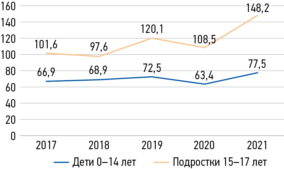 Цель — оценить показатели заболеваемости и оказание медицинской помощи детям Санкт-Петербурга с болезнями костно-мышечной системы с 2017 по 2021 г.