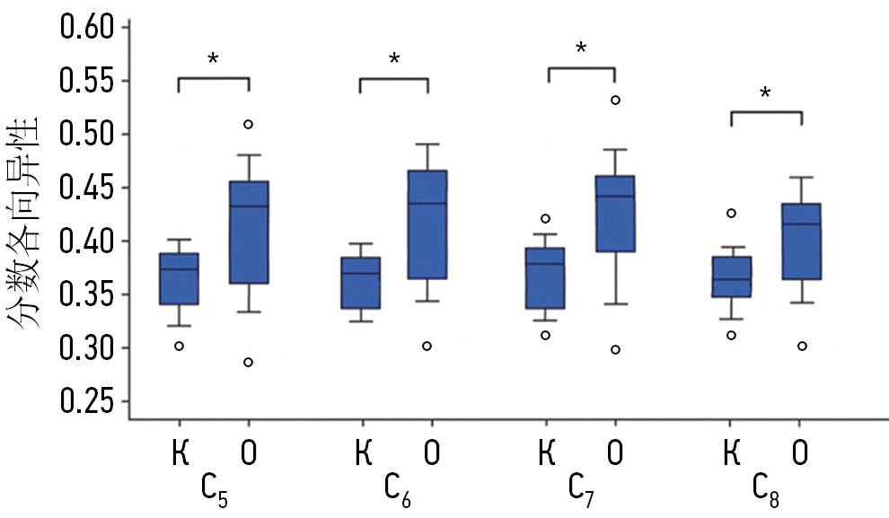 图2。脊神经束C5-Th1的分数各向异性。K,对照组;O,主要组(受伤臂丛一侧);*差异有统计学意义(p<0.05)