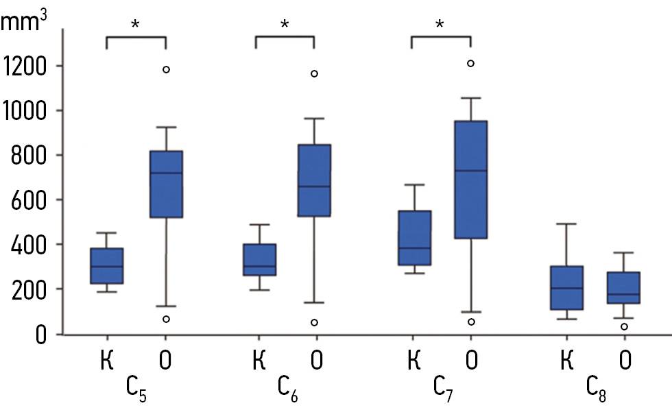 图3。臂丛受损侧(O)和未受损侧(K)神经束分支的体积。*受损和未受损臂丛一侧的SN束分支体积在统计学上有显著差异
