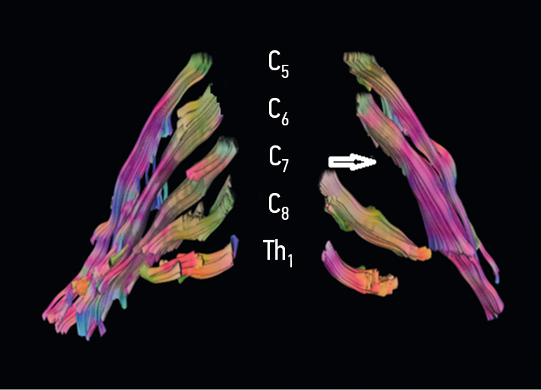 Рис. 1. Пациент К., 11 лет. Трехмерная реконструкция трактов спинномозговых нервов. Парез Эрба слева. Отсутствие СН С7 указано стрелкой