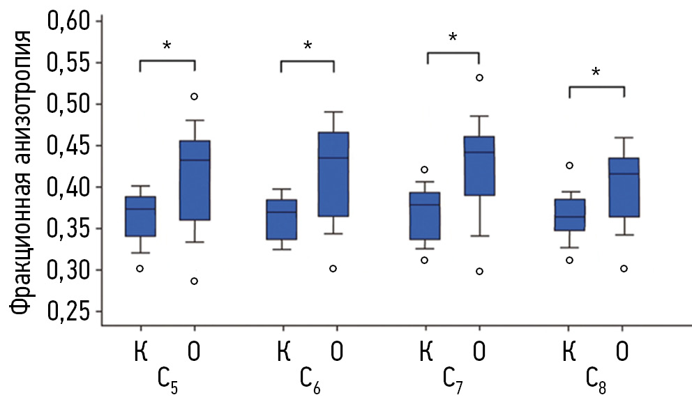 Рис. 2. Фракционная анизотропия трактов спинномозговых нервов С5–Th1. К — контрольная группа; О — основная группа (на стороне поврежденного плечевого сплетения); * статистически значимые различия (р < 0,05)