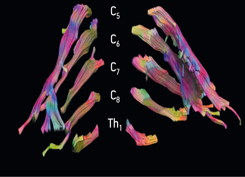 Диффузия воды в тканях организма может быть ограничена в большей или меньшей степени в силу биологических барьеров (мембран) или увеличения или уменьшения внеклеточного пространства [14]. Периферические нервы представляют собой высокоорганизованную структуру с многочисленными барьерами для диффузии воды, такими как эпиневрий, периневрий и эндоневрий. Периферические нервы визуализируют с использованием той же методологии, что и при исследовании трактов белого вещества в центральной нервной системе [18, 19]. ДТ МРТ плечевых сплетений позволяет осуществить трехмерную визуализацию спинномозговых нервов, участвующих в формировании плечевого сплетения, с помощью алгоритмов отслеживания, основанных на рассчитанных тензорах диффузии, получить представление о непрерывности экстрафораминальных нервных структур, формирующих плечевое сплетение [16].