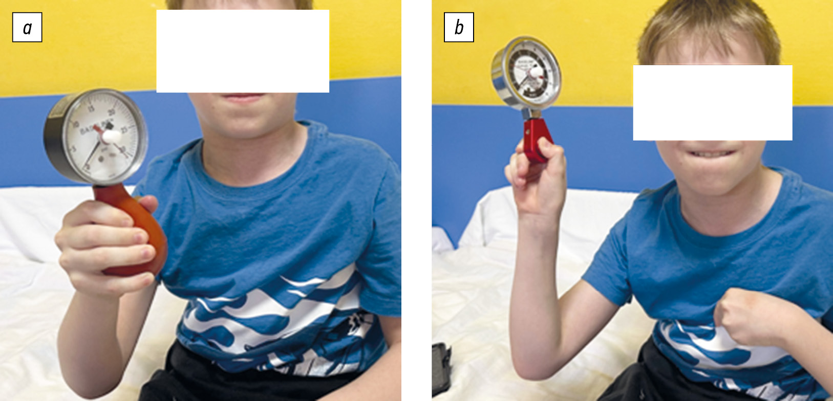 Fig. 1. Methods for assessing grip strength and pinch grip of the hand: (a) pneumatic dynamometer Baseline 12-0290 Dynamometer, Pneumatic Squeeze Bulb, 30 PSI Capacity (USA); (b) hydraulic pressure gauge Baseline 12-0226 Pinch Gauge, Hydraulic, LiTe, 50 lb Capacity (USA)