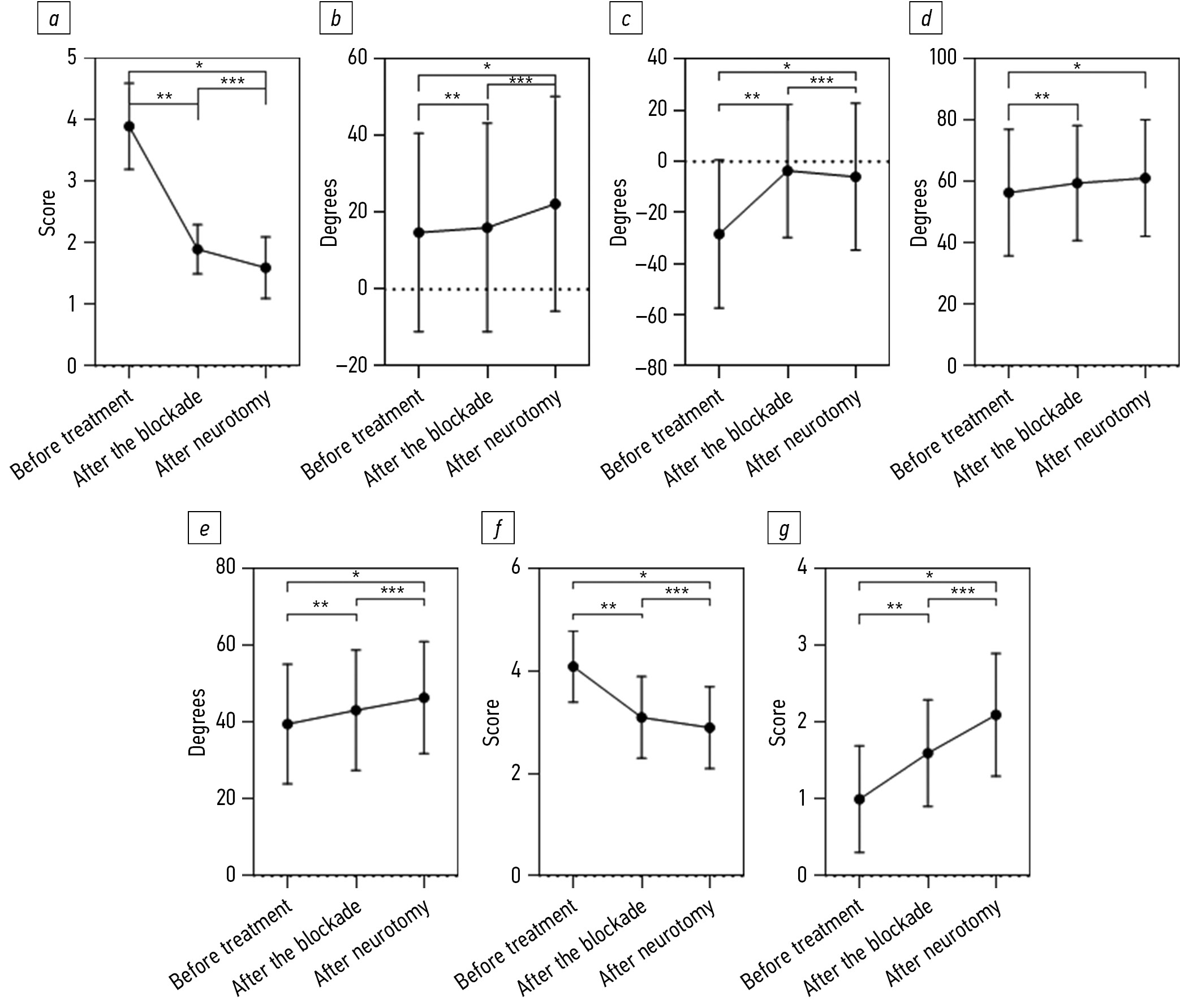 During the study, patients were examined three times: before and after a diagnostic blockade and after neurosurgical intervention. The treatment outcomes were analyzed 10 days after selective neurotomy. Primary standardized rehabilitation was started on day 3 after surgical treatment.