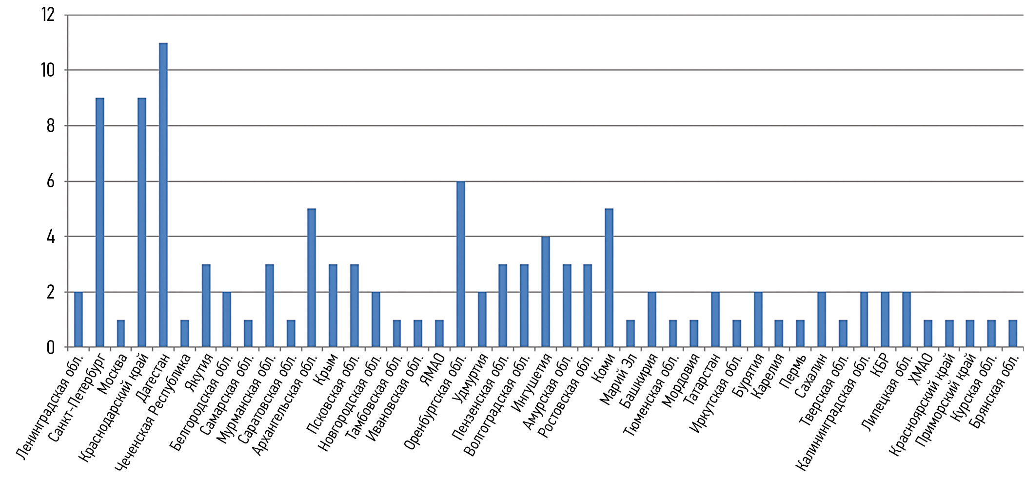 Fig. 1. Distribution of patients by regions of the Russian Federation. YNAO, Yamalo-Nenets Autonomous Okrug; KBR, Kabardino-Balkarian Republic; KMAO, Khanty-Mansi Autonomous Okrug (Yugra)