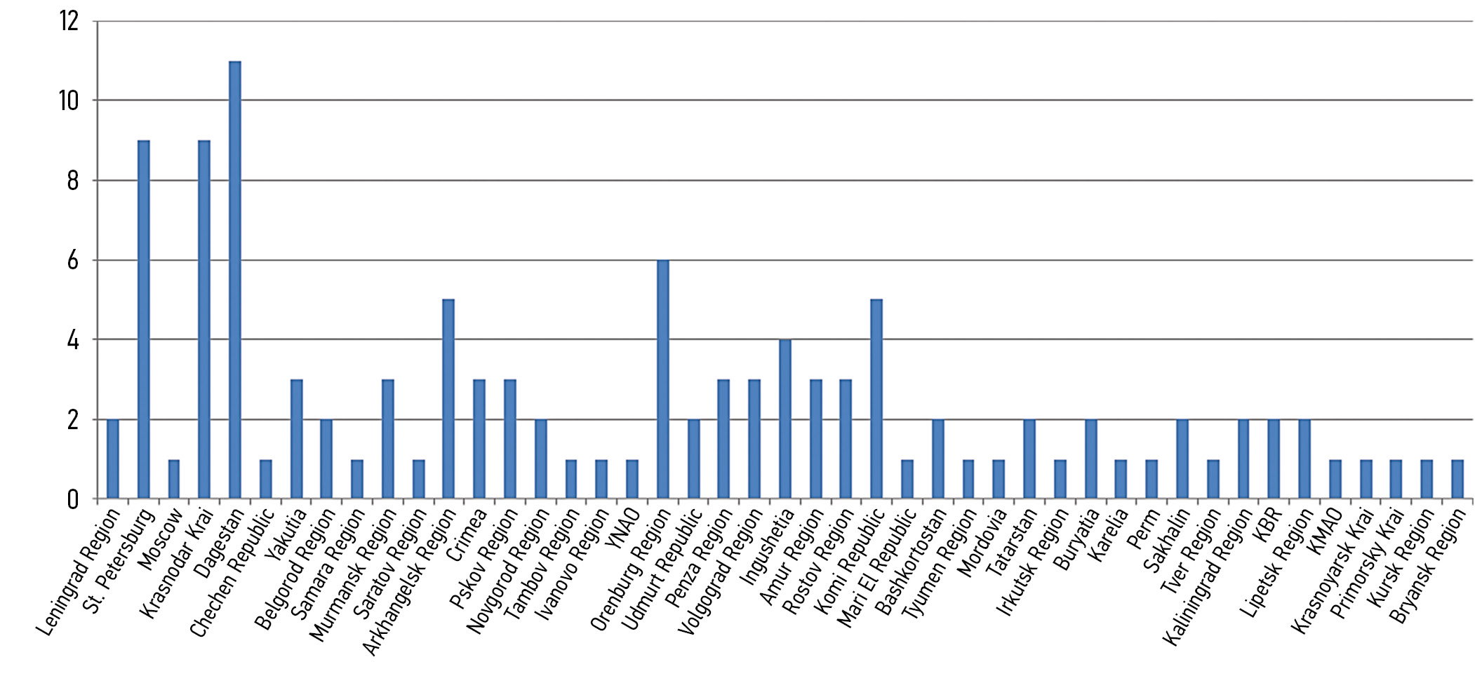 The analyzed group included patients from 45 regions of the Russian Federation, with uneven representation across some regions (Fig. 1).