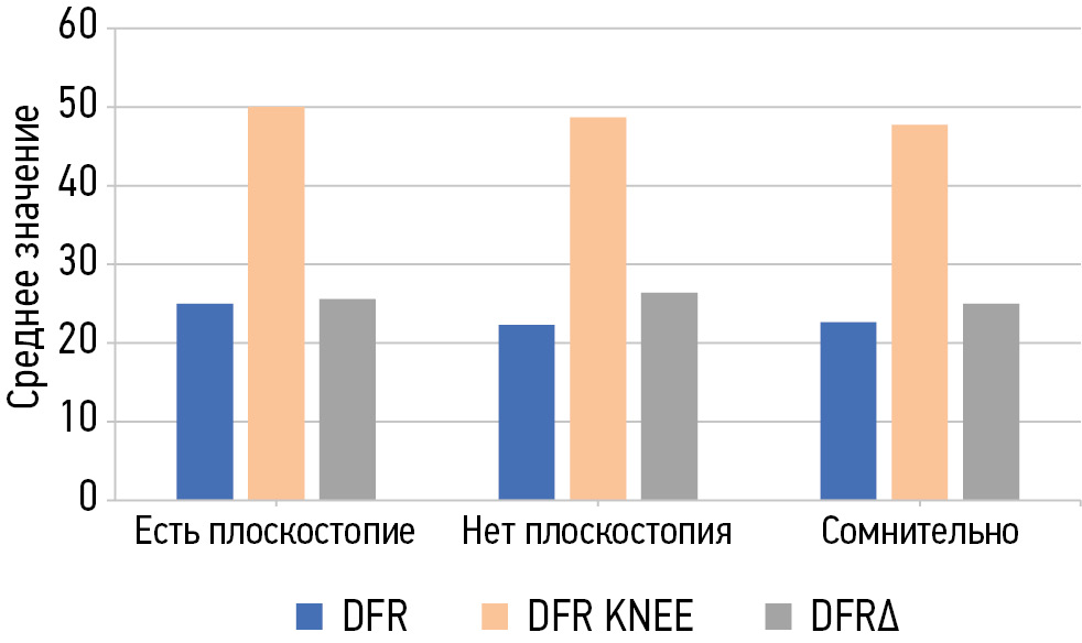 Примечание. DFR (dorsiflexion right) — тыльная флексия стопы справа; DFL (dorsiflexion left) — тыльная флексия стопы слева; DFR KNEE — тыльная флексия правой стопы с согнутым коленным суставом; DFL KNEE — тыльная флексия левой стопы с согнутым коленным суставом; DFRΔ — арифметическая разница между величиной тыльной флексии с согнутым и разогнутым коленным суставом для правой стопы; DFLΔ — арифметическая разница между величиной тыльной флексии с согнутым и разогнутым коленным суставом для левой стопы, р — уровень значимости.