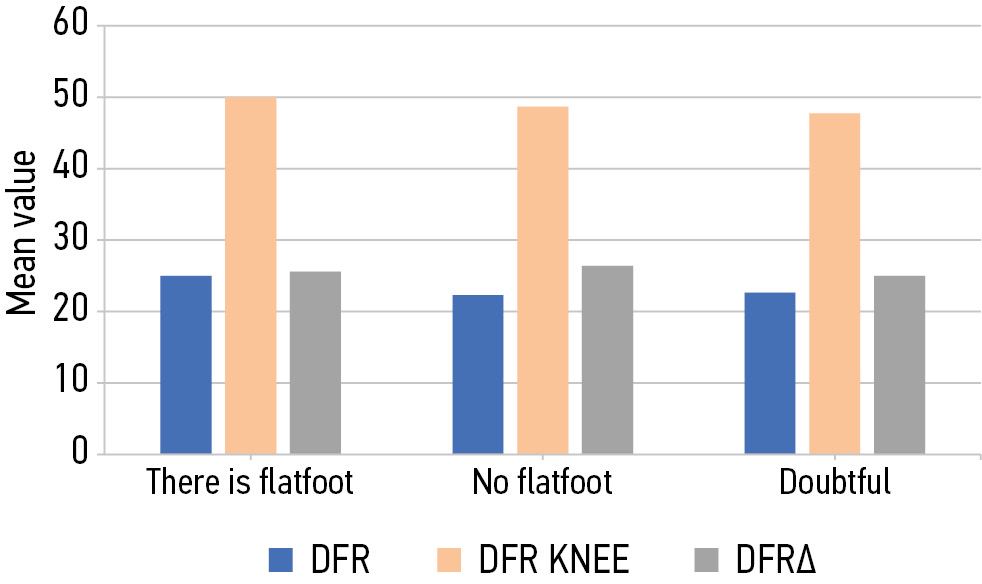 Note. DFR (dorsiflexion right), dorsiflexion of the right foot; DFL (dorsiflexion left), dorsiflexion of the left foot; DFR KNEE, dorsiflexion of the right foot with a flexed knee; DFL KNEE, dorsiflexion of the left foot with a flexed knee; DFRΔ, arithmetic difference in dorsiflexion between the flexed and extended knees for the right foot; DFLΔ, arithmetic difference in dorsiflexion between the flexed and extended knees for the left foot; p, significance level.