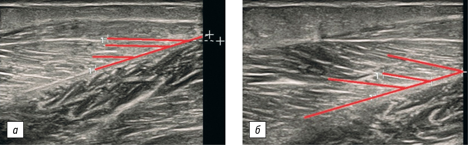 Рисунок. Ультрасонограммы медиальной головки икроножной мышцы пациента с гипермобильным плоскостопием и укорочением ахиллова сухожилия — увеличение угла пеннации: а — до начала программы стретчинга; б — через 6 мес. ее регулярного применения
