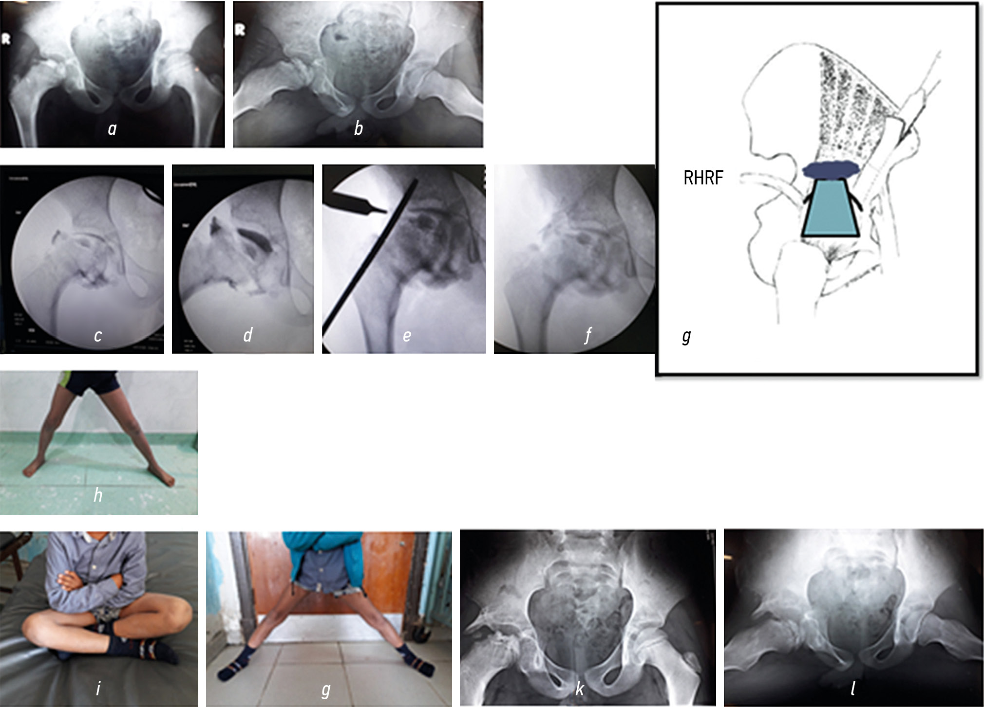 Fig. 2. Ten years old male with Legg-Calvé-Perthes disease right hip. Pre-operative x rays: a — anterio-posterior pelvis; b — lateral frog position. Intraoperative hip arthrogram showing hinge abduction; c — neutral; d — in abduction; e — direction of slot of shelf; f — after Shelf placement; g — diagram shows Trapezoidal shaped shelf with cancellous fragments at the edge of iliac bone; h — preoperative abduction. After 3 years follow up: i and j — postoperative range of motion; k — anterio-posterior pelvis; l — lateral frog position. RHRF — reflected head of Rectus Femoris