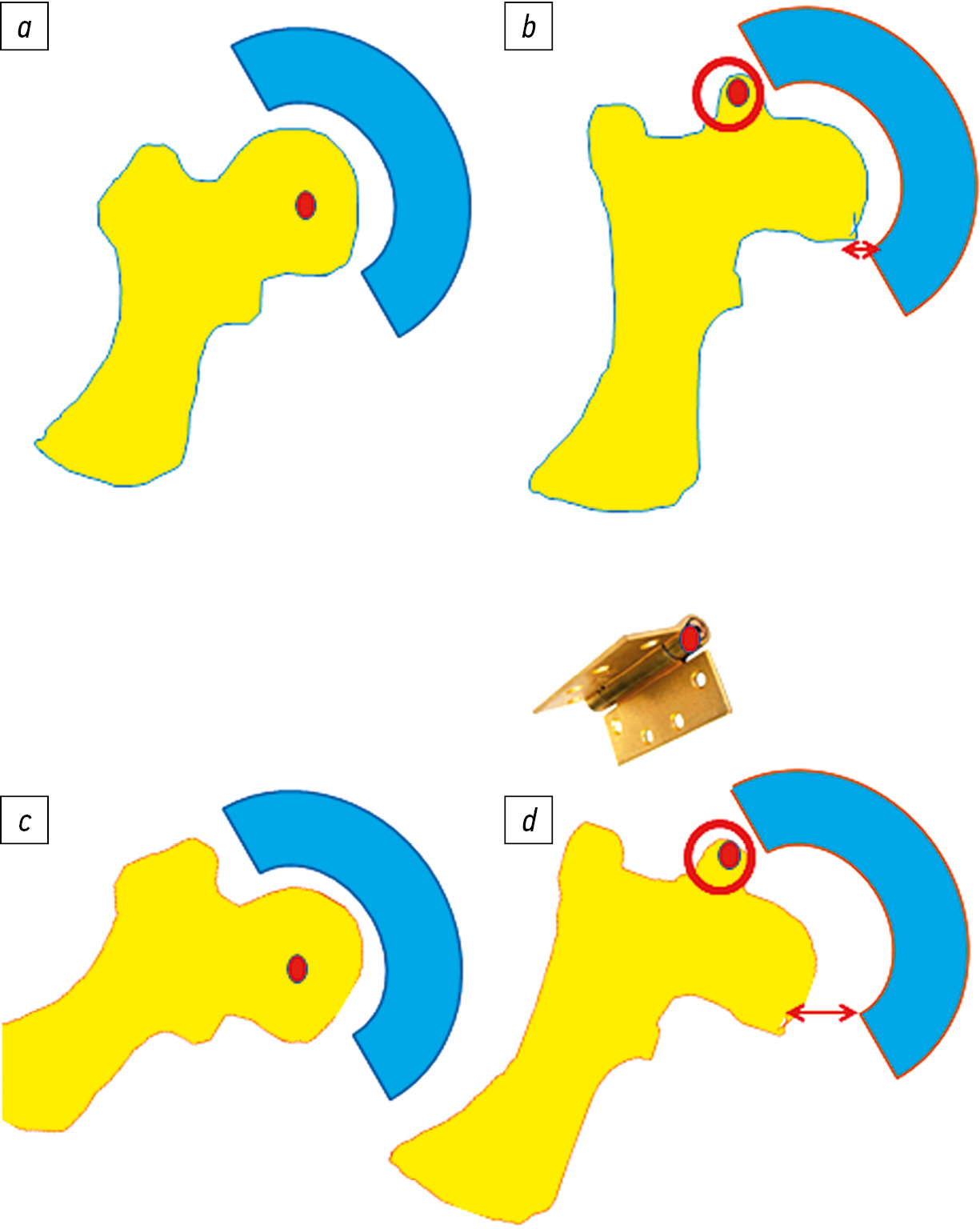 Fig. 1. Hinge Abduction Illustration: a — normal hip in neutral position; b — deformed hip with superiolateral bump in neutral position; c — normal hip in abduction rotates around axis in the centre of the head; d — deformed hip hinges around axis at the superiolateral margin during abduction with medial joint space widening