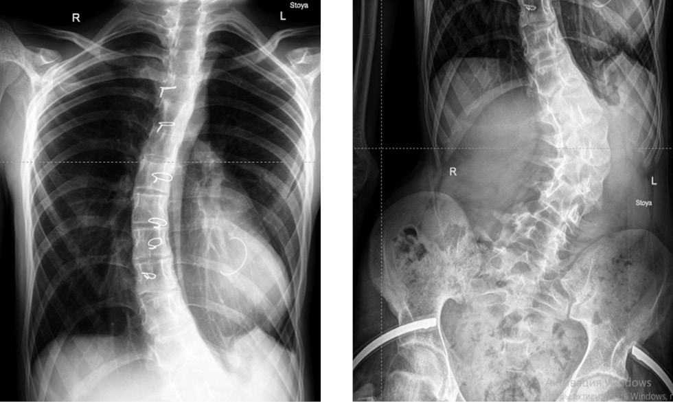 Рентгенография грудной клетки: не выявлено особенностей по сравнению с данными компьютерной томографии, определена деформация позвоночника с основной левосторонней поясничной дугой с вершиной на II позвонке до 78° и грудным правосторонним противоискривлением до 34° в положении стоя (рис. 1).