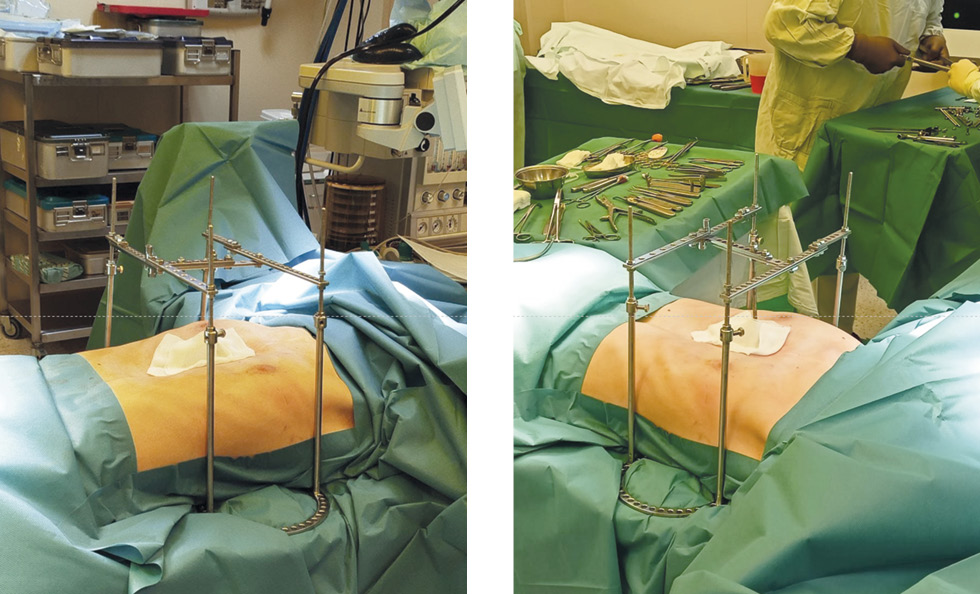 Оперативное лечение проведено из трех доступов, два из которых длиной 40 мм располагались справа и слева по переднеподмышечной линии на уровне V ребра, один — субмечевидный длиной до 65 мм. Из субмечевидного доступа с учетом практически полного слияния реберных дуг в этой зоне выполнена парциальная резекция VII ребра в составе реберной дуги слева на протяжении 40 мм. Кроме того, из этого же доступа резецирован фрагмент реберного хряща IV ребра справа. В результате сформированных подходов на уровне резецированных реберных хрящей был создан канал в ретростернальное пространство, заполненный рубцово-измененными тканями, фиксирующими к дорсальной поверхности грудины перикард правых отделов сердца, аорту и нижнюю полую вену. После этого на операционном столе смонтирован аппарат внешней фиксации с опорной пластиной на винтовой стойке с возможностью постепенной элевации грудины на дистракционном винтовом устройстве (рис. 2). С применением смонтированного аппарата после выделения ретростернального пространства, достаточного для расположения опорной пластины с использованием общехирургического инструментария под визуальным контролем осуществлен постепенный релиз дорсальной поверхности грудины до уровня второго межреберья (рис. 2).