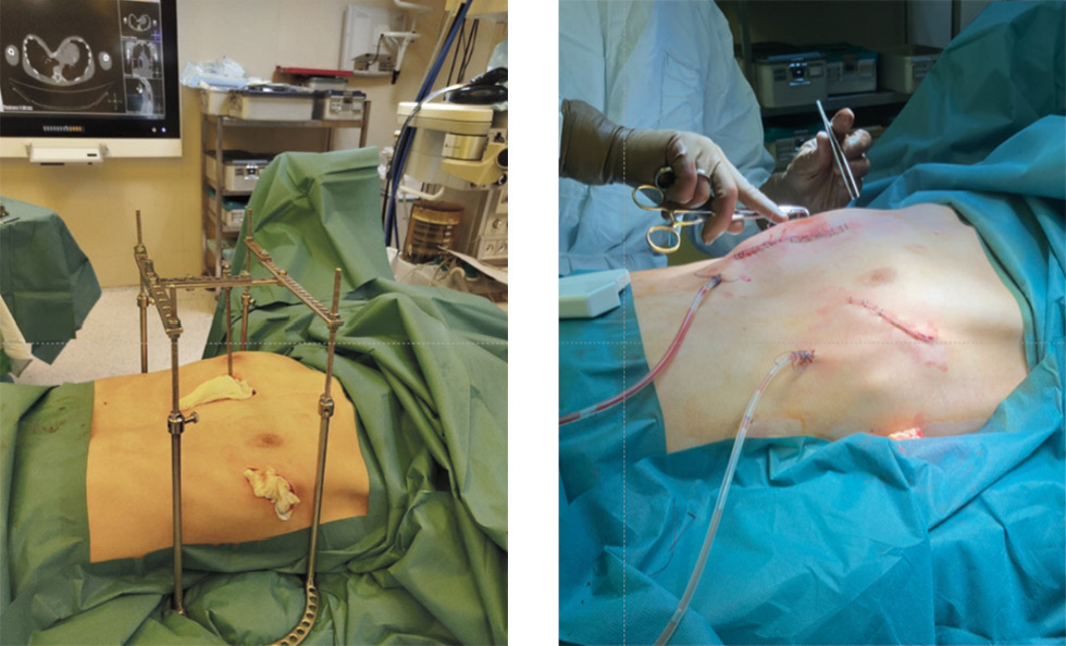 Рис. 3. Этап перехода от элевации грудино-реберного комплекса аппаратом внешней фиксации к остеосинтезу двумя пластинами.