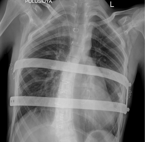 Компьютерная томография грудной клетки: определена деформация грудной клетки с воронкообразным компонентом, асимметричным, индекс Галлера 15,170 / индекс компрессии 0,154 / угол грудино-реберного комплекса 34° правосторонний. Консолидированная стернотомия в условиях проволочных серкляжных швов на 6 уровнях, дистальный край грудины в непосредственной близости от вентральной поверхности позвоночника и магистральных сосудов (аорта, нижняя полая вена). Определено опорное полукольцо сердца (пластика митрального клапана).