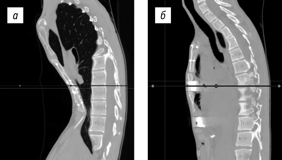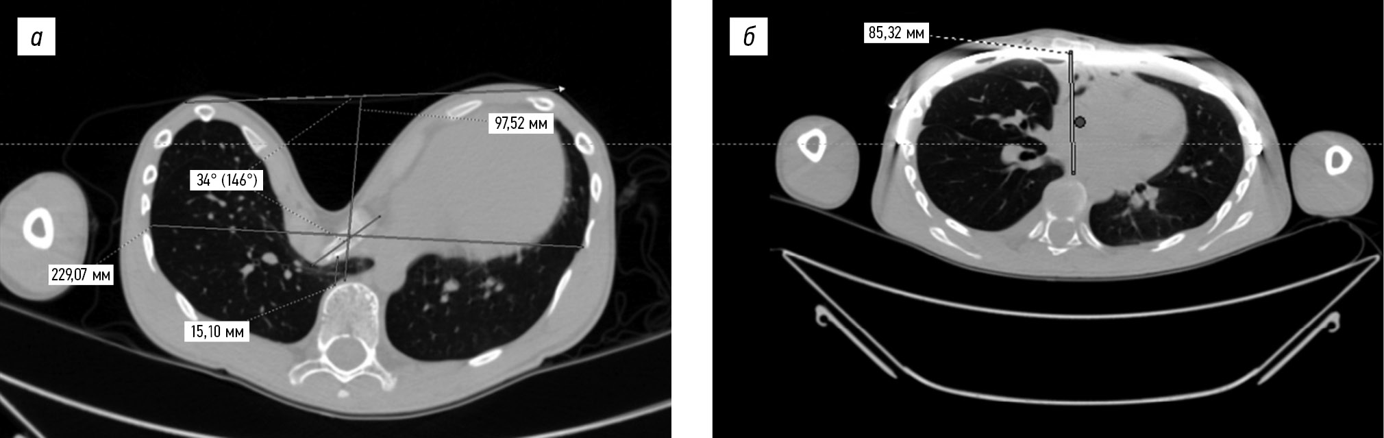 Рис. 5. Компьютерные томограммы до и после коррекции: a — исходный размер ретростернального пространства, до операции; б — контрольное исследование на 5-е сутки после операции.