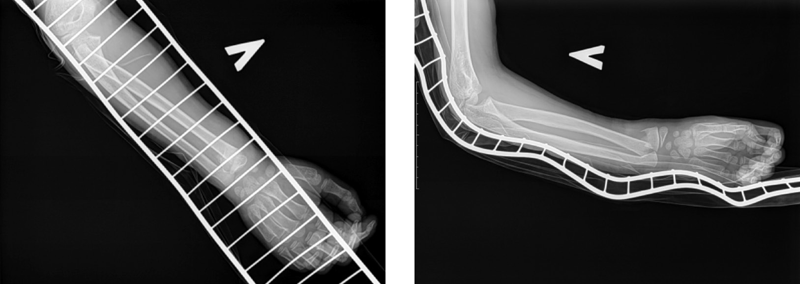 В исследовании был применен лучевой (рентгенографический) метод. На рентгенограммах в сагиттальной и фронтальной плоскости, выполненных в пред- и послеоперационном периоде (через 1, 3, 6 и 12 мес.), оценивали деформацию лучевой кости (ее величину и динамику), наличие патологических изменений в области зоны роста и эпифиза, корректность положения спицы Киршнера и динамику консолидации перелома.