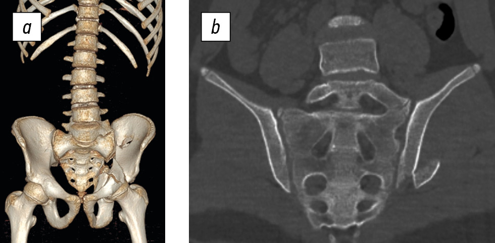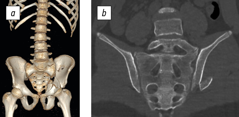 Рис. 1. 3D-реконструкциия (a) и результат (b) компьютерной томографии нижнего грудного, поясничного отделов позвоночника, костей таза, тазобедренных суставов 16-летней пациентки. Повреждение подтипа IIIb левой половины таза (переломы вертлужной впадины, крыла подвздошной кости). Переходный пояснично-крестцовый позвонок, подтип IIа.