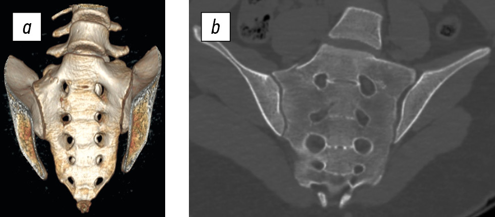 Рис. 2. 3D-реконструкциия (a) и результат (b) компьютерной томографии нижнего поясничного отдела позвоночника, крестца 16-летней пациентки. Повреждение крестца типа «а» (перелом крыла справа). Переходный пояснично-крестцовый позвонок, тип III, подтип «b».