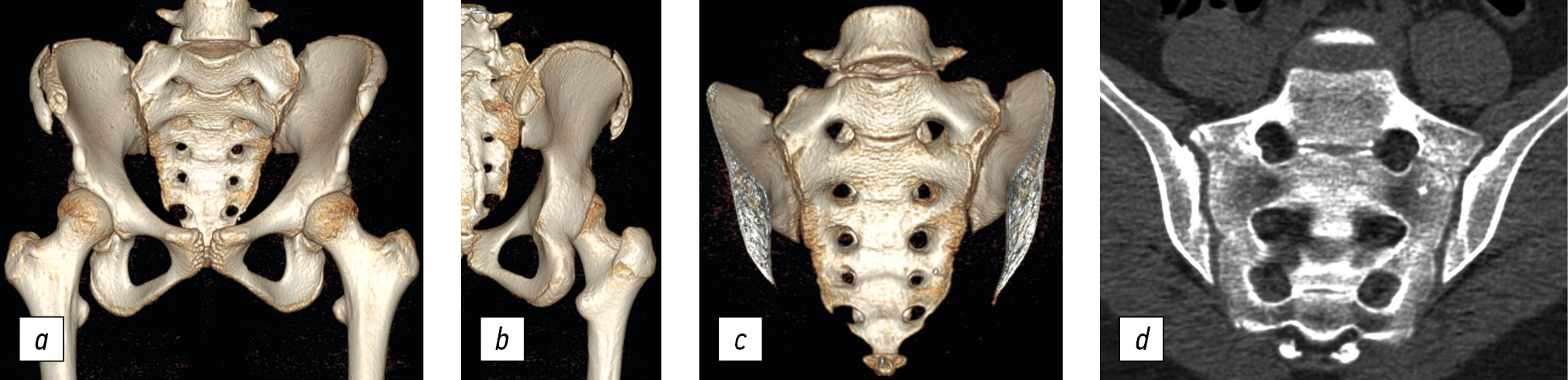 Рис. 3. 3D-реконструкциия (a, b, c) и результат (d) компьютерной томографии нижнего поясничного отдела позвоночника, костей таза, тазобедренных суставов 13-летней пациентки. Отрывной перелом гребня правой подвздошной кости (a, b). Переходный пояснично-крестцовый позвонок, тип II, подтип «b» (а, c, d).