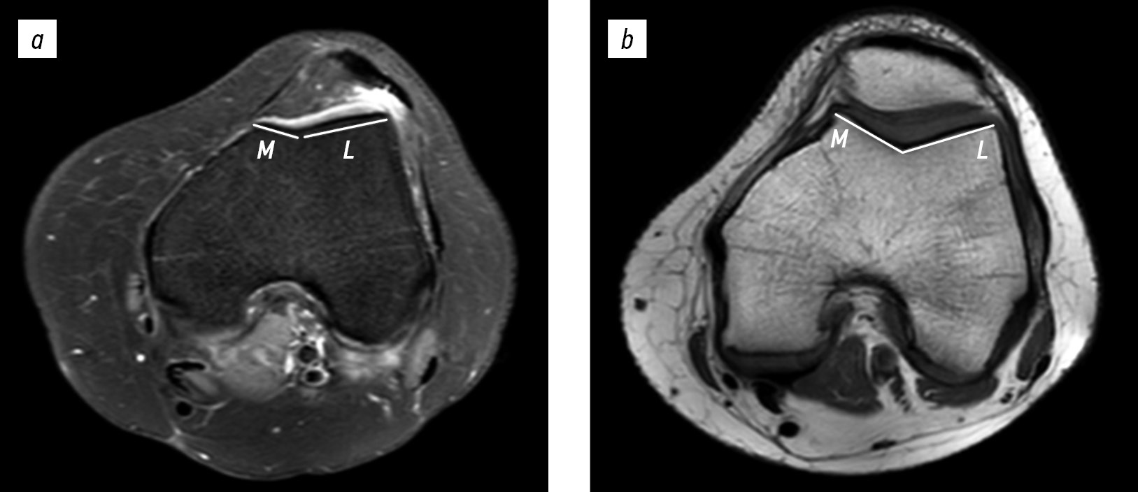 Fig. 2. Trochlear facet asymmetry index on magnetic resonance imaging: (a) 16-year-old female patient with patellar instability (33%) and (b) 17-year-old female patient with anterior cruciate ligament injury (75%). M, medial facet length; L, lateral facet length.