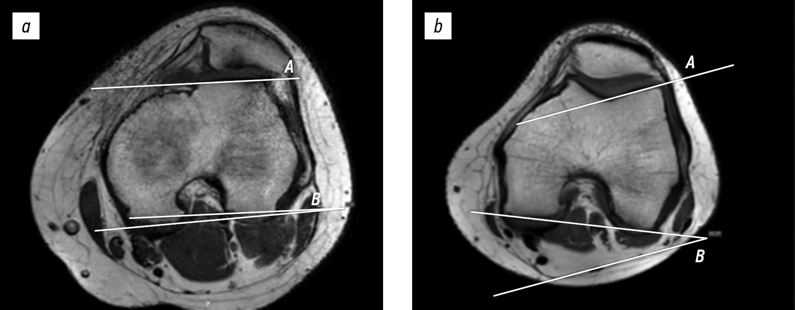 Fig. 1. Lateral trochlear inclination on magnetic resonance imaging in a 15-year-old female patient with patellar instability (1.2°) (a) and in a 17-year-old female patient with anterior cruciate ligament injury (21°) (b). A, line tangent to the lateral facet; B, line tangent to the posterior condylar line.
