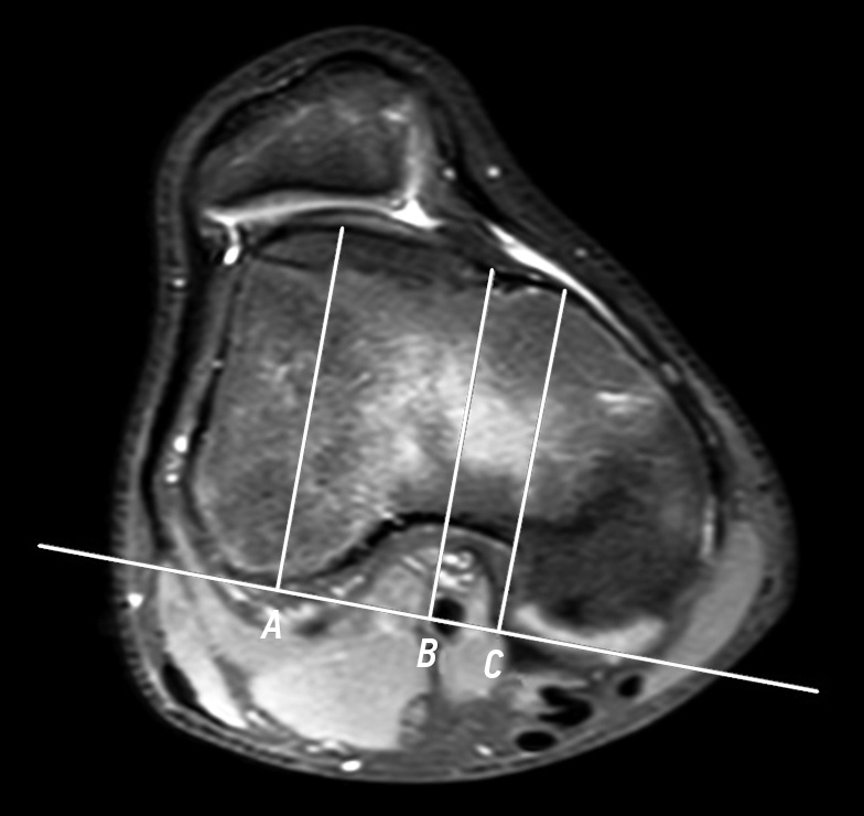 Furthermore, the depth of the trochlear groove was assessed using axial slices. The measurement was performed using the formula ([A + B/2] − C) proposed by Pfirrmann et al. [14]. Distances A and B were defined as the maximal anteroposterior measurements from the posterior aspects of the femoral condyles to the subchondral bone of the trochlear groove at the lateral and medial sides, respectively. Distance C represented the minimal anteroposterior distance from the deepest point of the trochlear groove to a line parallel to the posterior contours of the femoral condyles (Fig. 3).