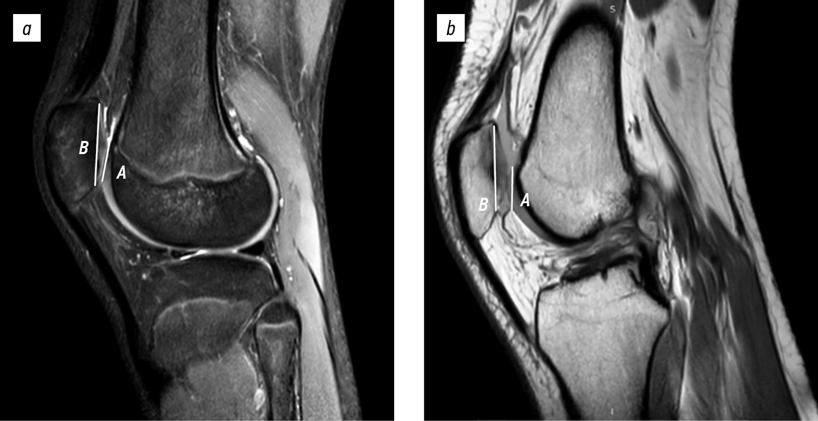 Moreover, MRI was used to determine the presence of free osteochondral bodies and signs of medial patellar margin fracture, and the patellotrochlear index was analyzed. On lateral projection, the height of the patellar articular surface (B) and portion of the trochlear groove articulating with the patella (A) were measured. The ratio А/В × 100% was calculated, with values <12.5% considered normal according to scientific data (Fig. 4) [17].