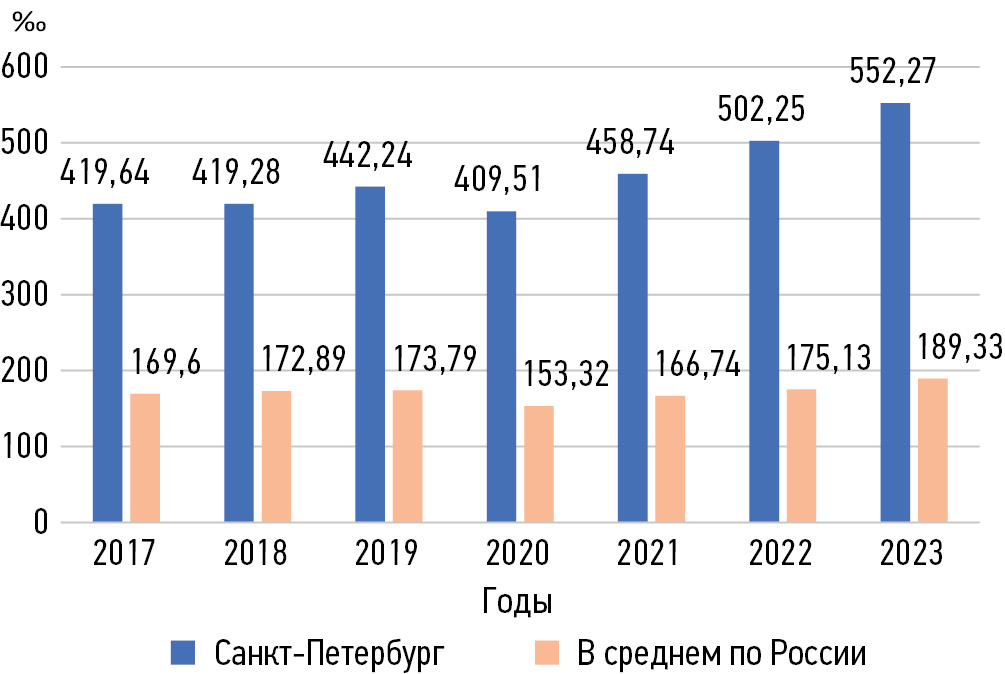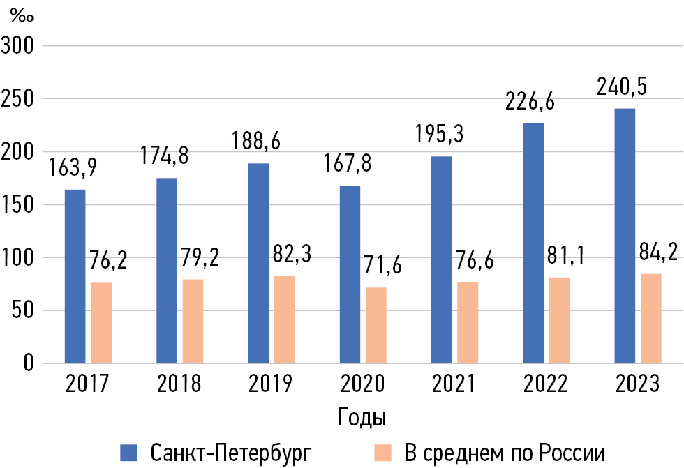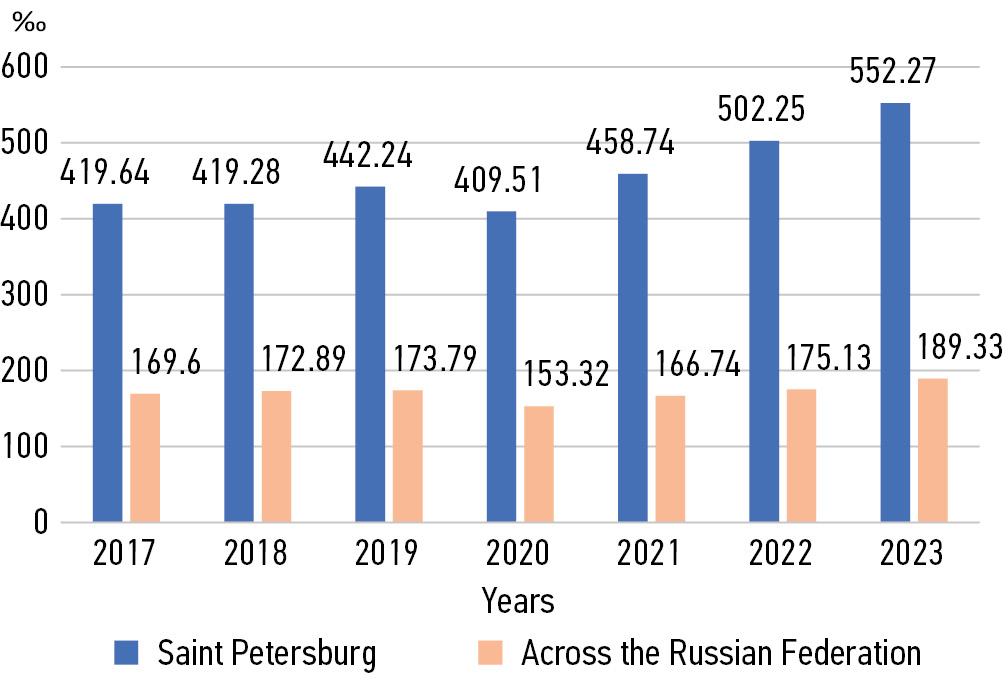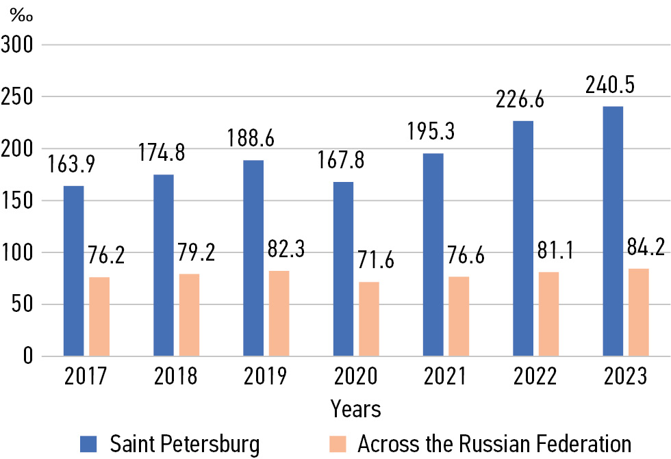 Fig. 1. Overall morbidity rate of musculoskeletal and connective tissue diseases among children aged 0–14 years in Saint Petersburg and across the Russian Federation in 2017–2023 (per 1000 children of the corresponding age group).