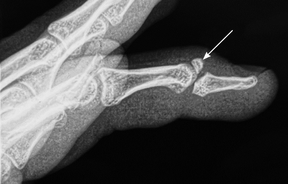 Рис. 1. Рентгенограмма ребенка 14 лет с авульсивным переломом основания ногтевой фаланги (mallet fracture) III пальца правой кисти со смещением.