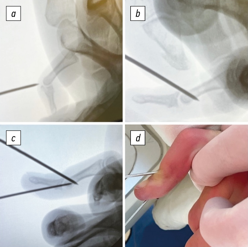 Рис. 3. Этапы оперативного лечения методом Ишигуро: a — сгибание ногтевой фаланги и введение спицы Киршнера в среднюю фалангу над периферическим отломком; b — разгибание ногтевой фаланги и репозиция отломка; c — трансартикулярная фиксация дистального межфалангового сустава в положении разгибания; d — внешний вид пальца по завершении операции.