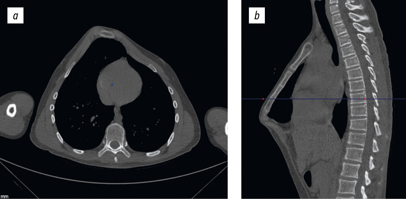 Рис. 1. Компьютерная томограмма грудной клетки пациента Г., 17 лет до начала оперативного лечения в горизонтальной плоскости (a), в сагиттальной плоскости (b). Индекс Галлера 1,4, угол ротации грудины 12° вправо, индекс компрессии 0,9.