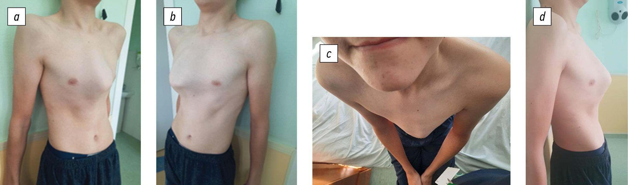 При осмотре пациент передвигается с использованием дополнительных опор и ортопедической обуви. Бытовые нагрузки выполняет самостоятельно, трудоспособность снижена на фоне спастической диплегии. Визуализирована килевидная деформация грудной клетки, островершинная форма, корпо-костальный тип, асимметричный правосторонний с высотой выбухания 72 мм, компрессионный тест деформации негативный — менее 40% коррекции при максимальной нагрузке в 7 кг/см2. Отмечена выраженная болезненность на вершине деформации, краниальная граница искривления начинается от I ребра, асимметричное западение реберных дуг (выражено грубее слева) (рис. 2, а–с).