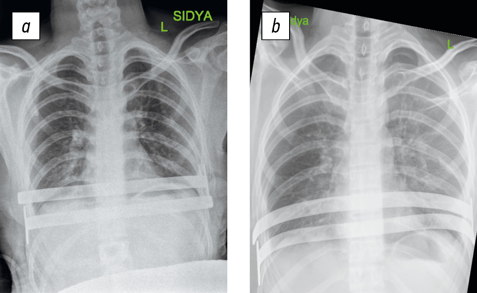 Рис. 3. Рентгенограмма грудной клетки: на 1-е (а), на 5-е (b) сутки после оперативного лечения.