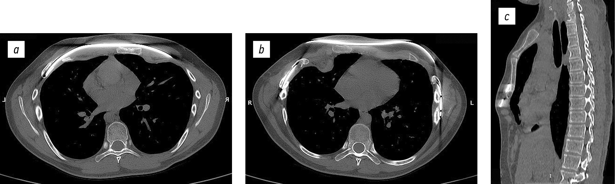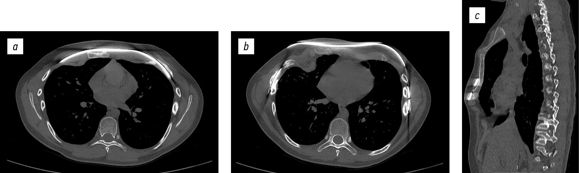 Рис. 4. Компьютерная томограмма грудной клетки после оперативного лечения: горизонтальная плоскость (а, b), сагиттальная плоскость (c). Индекс Галлера 2,19, угол ротации грудины 3° — симметричная, индекс компрессии 0,8.