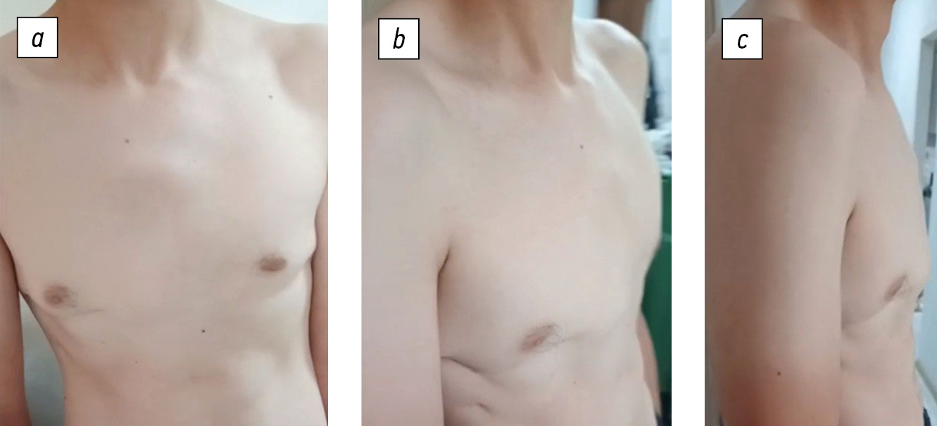 Рис. 6. Пациент Г., 18 лет. Килевидная деформация грудной клетки, правосторонняя, островершинная форма, корпо-костальный тип, тяжелой степени, через 1 год после оперативного лечения: a — ракурс спереди; b — ракурс 3/4 справа; c — ракурс сбоку.