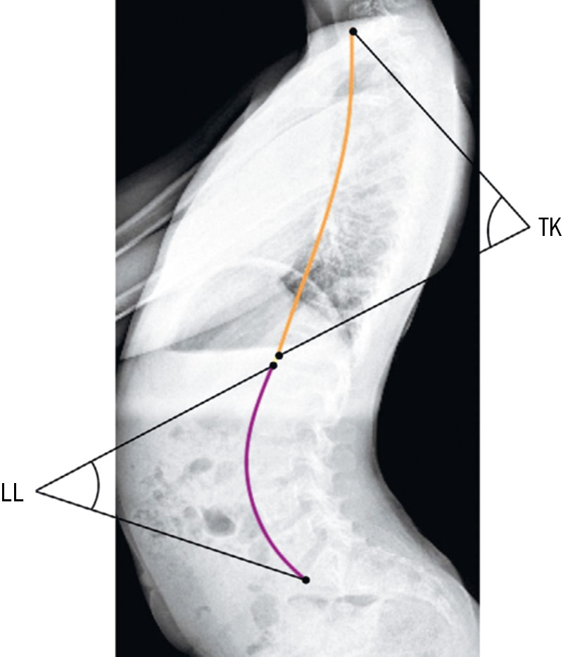 Рис. 2. Схема измерения сагиттальных параметров позвоночника по боковой рентгенограмме. TK, Thoracic kyphosis и LL, Lumbar lordosis определяют по углам между точками, соответствующими границам и вершинам дуг грудного и поясничного отделов позвоночника.