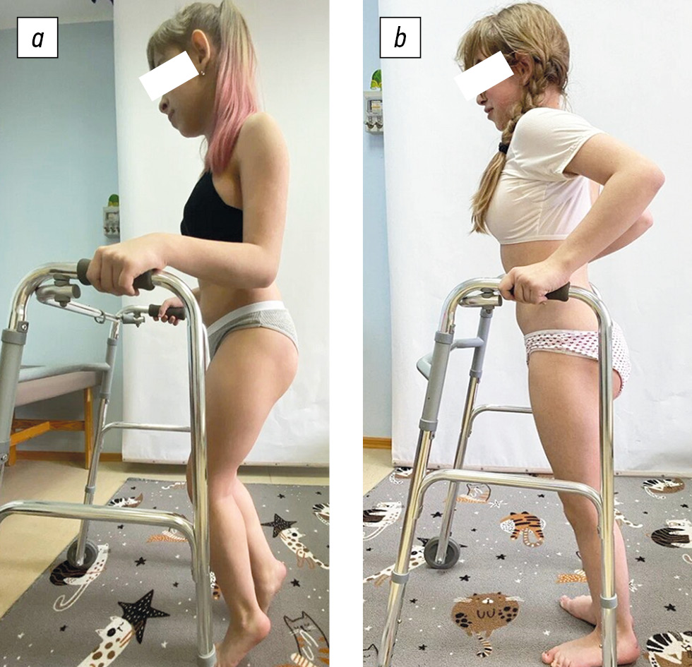 Рис. 3. Общий вид пациента сбоку: a — до хирургического лечения; b — после хирургического лечения.