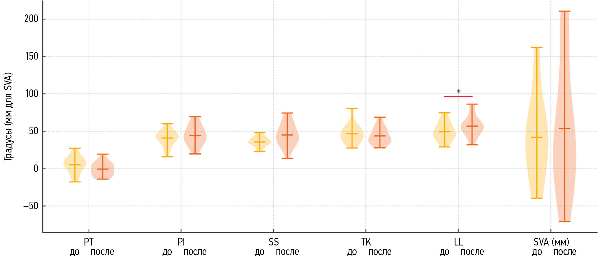 При оценке сагиттальных параметров позвоночника и таза выявлено статистически значимое увеличение поясничного лордоза (LL) с 39,2±6,3° до 45,8±5,9° (p=0,018). Остальные показатели глобального сагиттального профиля (PI, PT, SS, TK и SVA) значимых изменений не продемонстрировали (p >0,05, рис. 1).