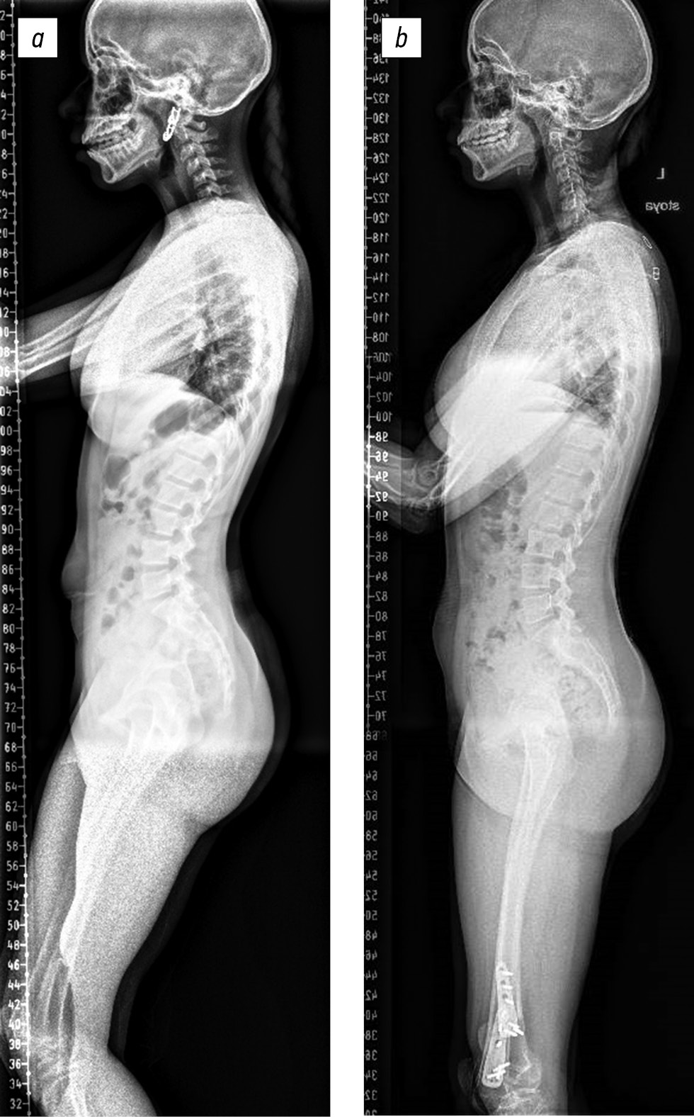 Рис. 5. Рентгенограммы скелета в боковой проекции: а — до хирургического лечения; b — после хирургического лечения.
